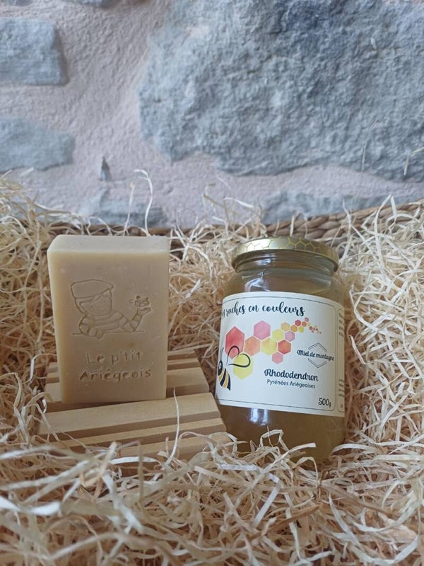 En français : Ce savon surgras est composé de beurre de karité brut, d’huiles d’olive, de coco, d’amande douce, de ricin, de glycérine naturelle ainsi que du miel de rhododendron Ariégeois.